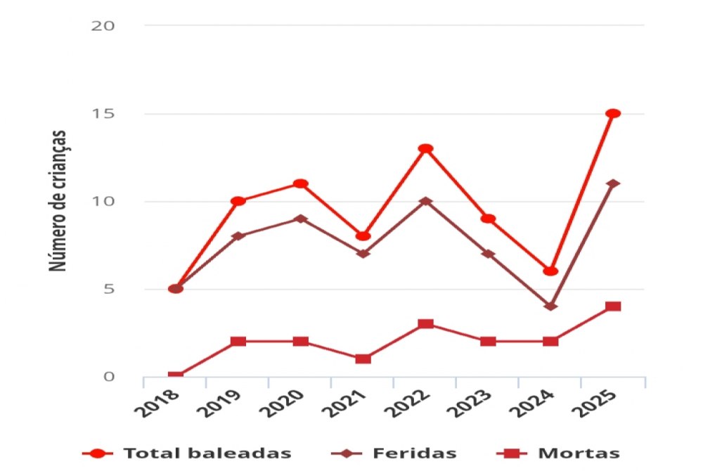 Até esta segunda-feira (13), 15 crianças de até 11 anos foram atingidas por disparos de arma de fogo este ano, das quais quatro morreram e 11 ficaram feridas, segundo dados do Fogo Cruzado.
